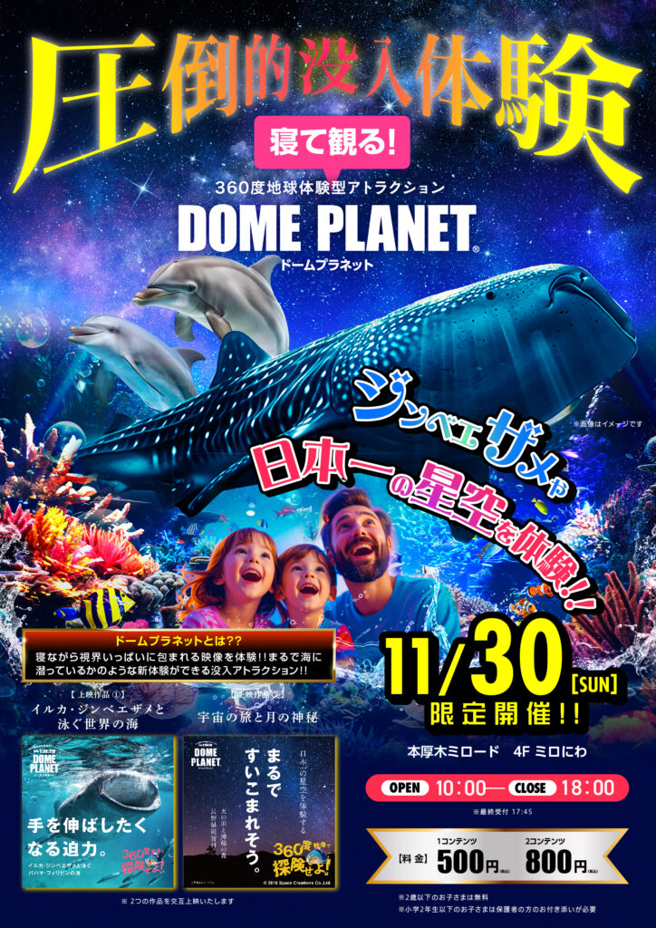 「知らない世界を体験する」をテーマに地球上の様々な自然・生き物・文化を360度映像で切り取りお届けする『ドームプラネット』を開催します!巨大なエアドームの中で360度の映像を見ることで、まるでその場にいるかのような体験ができる新感覚没入体験アトラクションです!!
