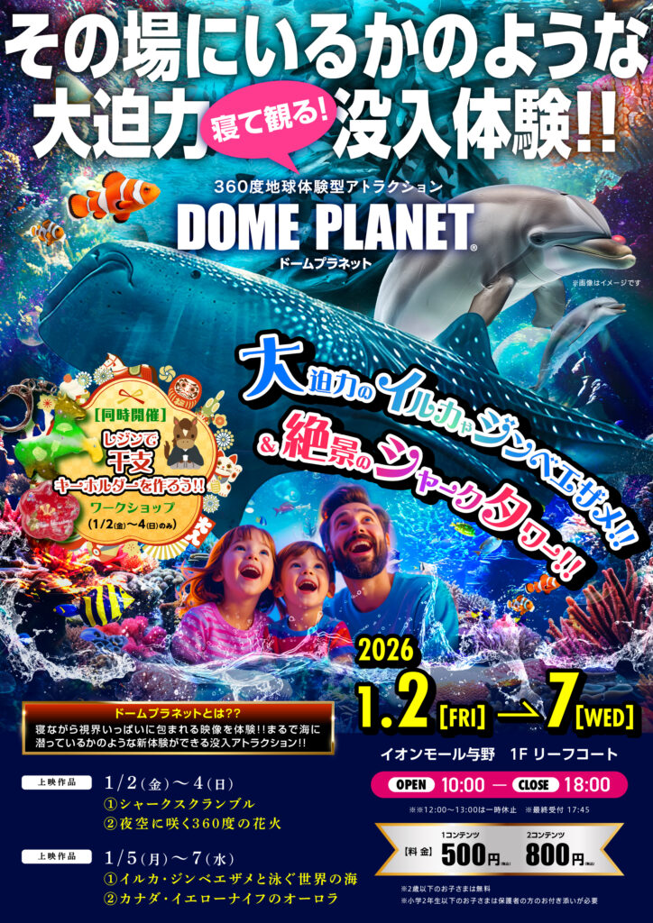 「知らない世界を体験する」をテーマに地球上の様々な自然・生き物・文化を360度映像で切り取りお届けする『ドームプラネット』と、ワークショップ『レジンチャーム作り』をイオンモール与野にて同時開催します。ドームプラネットとは、巨大なエアドームの中で360度の映像を見ることで、まるでその場にいるかのような体験ができる新感覚没入体験アトラクションです!!レジンチャーム作りでは、お好きな形の型でお正月の干支をモチーフにした可愛いチャームが作れます♪