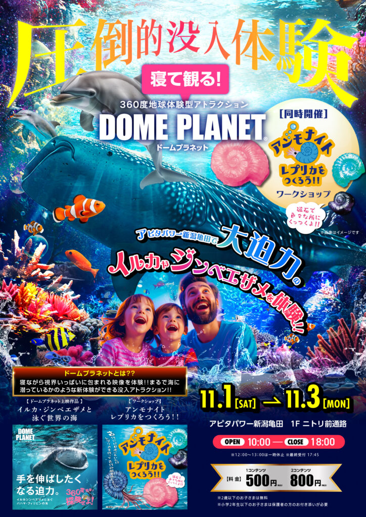 「知らない世界を体験する」をテーマに地球上の様々な自然・生き物・文化を360度映像で切り取りお届けする『ドームプラネット』と、ワークショップ『アンモナイトのレプリカ作り』をアピタパワー新潟亀田にて同時開催します。ドームプラネットでは360度の映像で、イルカやジンベエザメが泳ぐ世界の海を大迫力体験!まるで海の中にいるかのような臨場感に包まれたあとは、アンモナイトの化石レプリカ作りに挑戦!太古の海の生き物「アンモナイト」を自分の手で作って持ち帰れるワークショップです。見て、作って、学べる”海の冒険イベント”で海の世界を感じよう!
