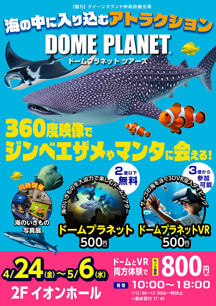 イオンモール東浦にて、「ドームプラネットツアーズ」を開催します!ド―ムプラネットツアーズは、視界いっぱいに広がるドーム映像とVRで、まさにその場にいるような感覚を楽しめる体験型アトラクションです。今回はジンベエザメやマンタ、グレートバリアリーフのサンゴの海など、海の世界をめぐります。