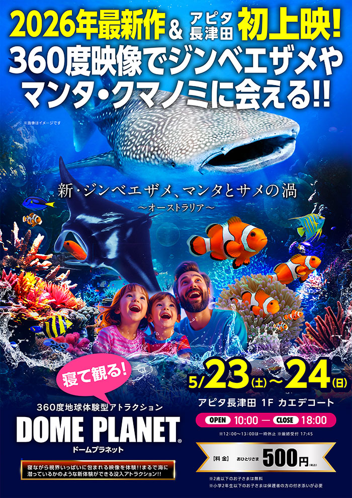 アピタ長津田にて、「ドームプラネット」を開催します!ド―ムプラネットは、巨大なエアドームの中で寝ながら360度の映像を観ることで、まるでその場にいるかのような体験ができる没入体験アトラクションです♪今回はドームプラネット最新作「新ジンベエザメ・マンタとサメの渦~オーストラリア~」を上映します。