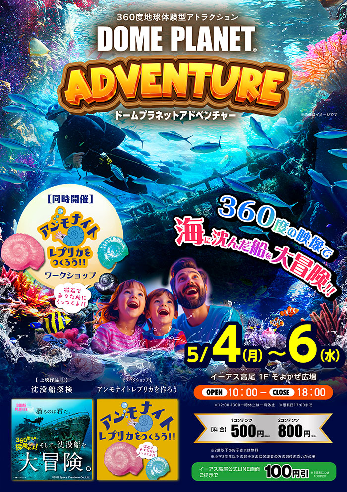 イーアス高尾にて、「知らない世界を体験する」をテーマに地球上の様々な自然・生き物・文化を360度映像で切り取りお届けする『ドームプラネット』と、ワークショップ『アンモナイトのレプリカ作り』を同時開催します。