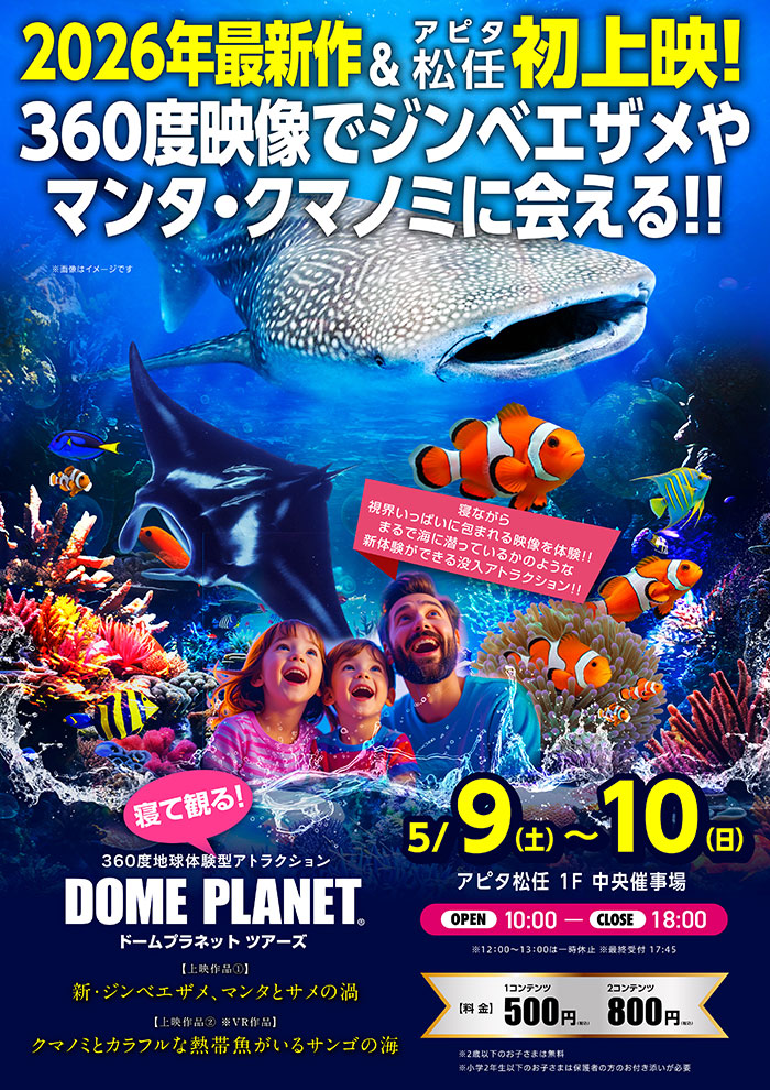 アピタ松任にて、「ドームプラネットツアーズ」を開催します!ド―ムプラネットツアーズは、視界いっぱいに広がるドーム映像とVRで、まさにその場にいるような感覚を楽しめる体験型アトラクションです。今回はジンベエザメやマンタ、グレートバリアリーフのサンゴの海など、海の世界をめぐります。