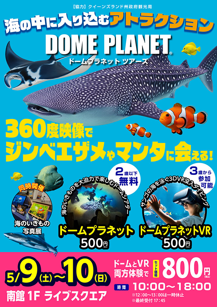 イオンモール新利府南館にて、「ドームプラネットツアーズ」を開催します!ド―ムプラネットツアーズは、視界いっぱいに広がるドーム映像とVRで、まさにその場にいるような感覚を楽しめる体験型アトラクションです。今回はジンベエザメやマンタ、グレートバリアリーフのサンゴの海など、海の世界をめぐります。